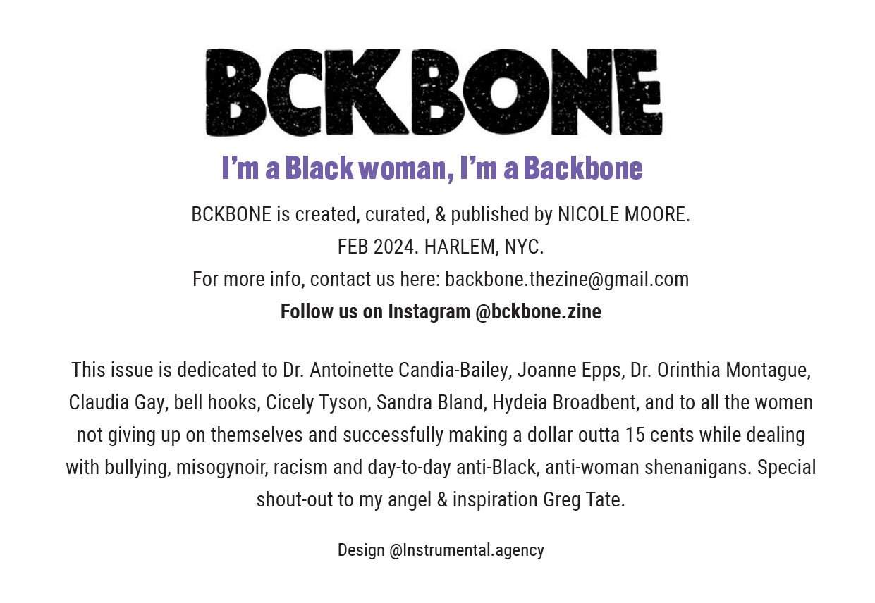 BCKBONE is a zine for Black women and femmes that uses poetry, art, and storytelling to serve up tips, tools, and tonics that empower and affirm. Using both personal and professional lessons learned and unlearned about identity, success, power, rage, healing, and love, BCKBONE, which launched in February 2024, serves as a reminder to Black women that we are our own best things.